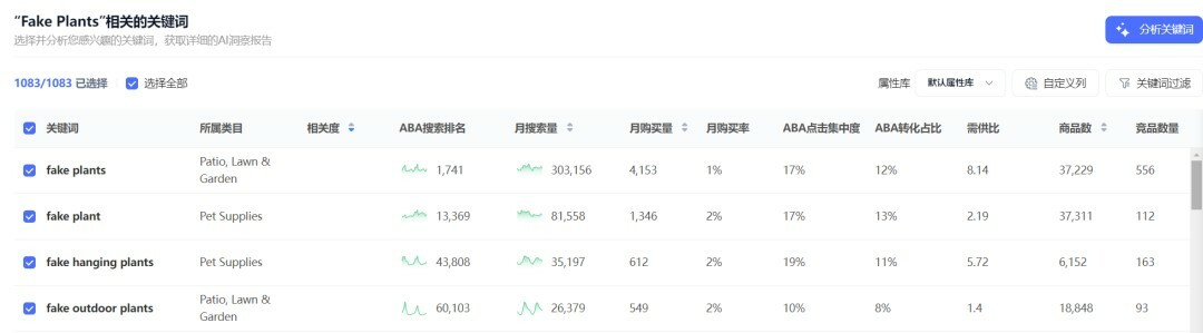 输入 Fake Plants 搜索后显示有 1000 多个关键词,全选进行 AI 分析