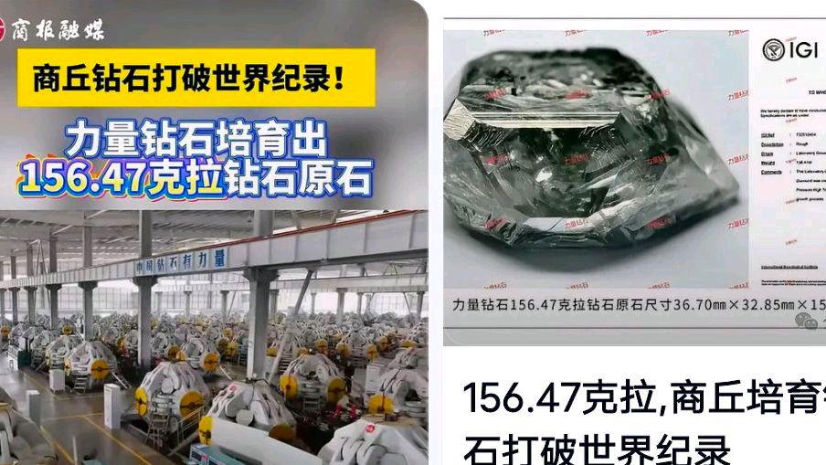 河南培育出全球最大钻石,这颗钻石的重量是156.47克拉,由河南省力量钻石股份有限公司采用高温高压法(HPHT) 培育而成,并已通过国际宝石研究院(IGI) 的认证,刷新了此前由Meylor Global公司保持的150.42克拉的纪录。